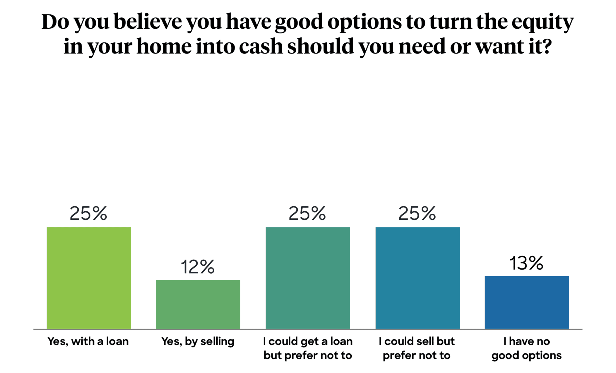 Twenty-five percent don’t want to take on a loan and the debt, interest, and monthly payments that come with it. Another 25 percent say they could sell their home to access equity but would prefer not to.