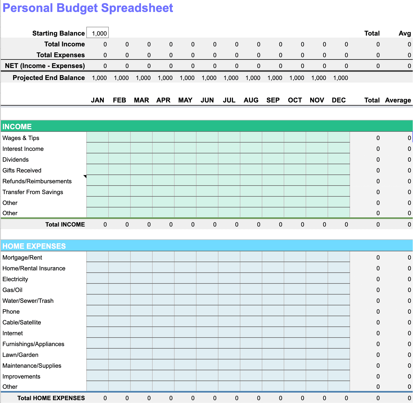 Your monthly credits will tally up your monthly income, including anything you’re earning from a full-time or part-time job, a side hustle, or contract work. If your income varies, consider using a typical average for a given month, or even be a little conservative and put in the lower-end of what you could earn to give you some wiggle room. For debits, list out your typical bills and expenses each month. You can DIY your budget doc, using templates in Google Sheets or Excel, or you can find some free templates that work for you and modify them to meet your needs, like this one from Vertex42.com.